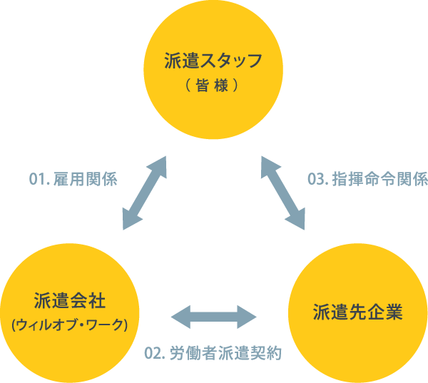 派遣スタッフ(皆様)とウィルオブ・ワークとの間に雇用契約が締結されます。